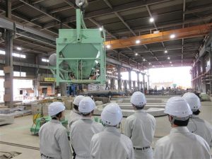 見学会では、PC(プレキャスト鉄筋コンクリート)工法(※)の特徴や強みについて紹介するとともに、製造工程や環境配慮への取り組みをご覧いただきました。また、社員との懇談の場では、技術的な内容や日々の業務についての質問が寄せられました。